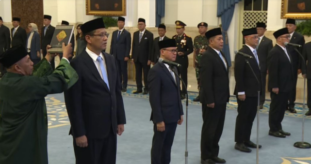 Usai pembacaan keputusan, Presiden Prabowo memimpin pembacaan sumpah jabatan. Dalam sumpahnya, para pejabat baru berjanji setia kepada Undang-Undang Dasar 1945, bekerja dengan penuh tanggung jawab, serta menjunjung tinggi etika jabatan.