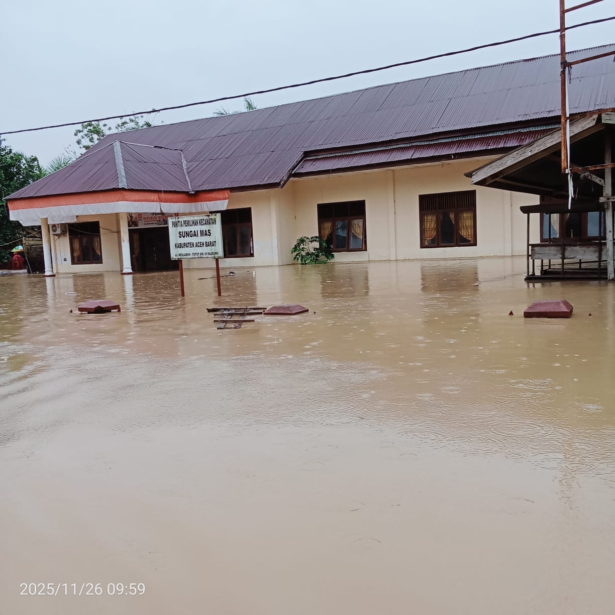 Banjir merendam wilayah Kabupaten Aceh Barat sejak Rabu (26/11). Banjir dipicu luapan air sungai Krueng Woyla dan Meureubo setelah sebelumnya hujan deras turun di wilayah tersebut. Sebanyan 183 unit rumah dilaporkan terdampak. (Dok. Ist)