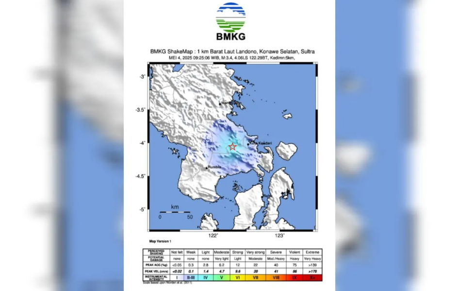 NASIONAL – Gempa bumi berkekuatan magnitudo 3,4 mengguncang wilayah Kabupaten Konawe Selatan (Konsel), Sulawesi Tenggara, pada Minggu (4/5/2025) pagi. Getaran gempa bahkan terasa hingga ke Kota Kendari.